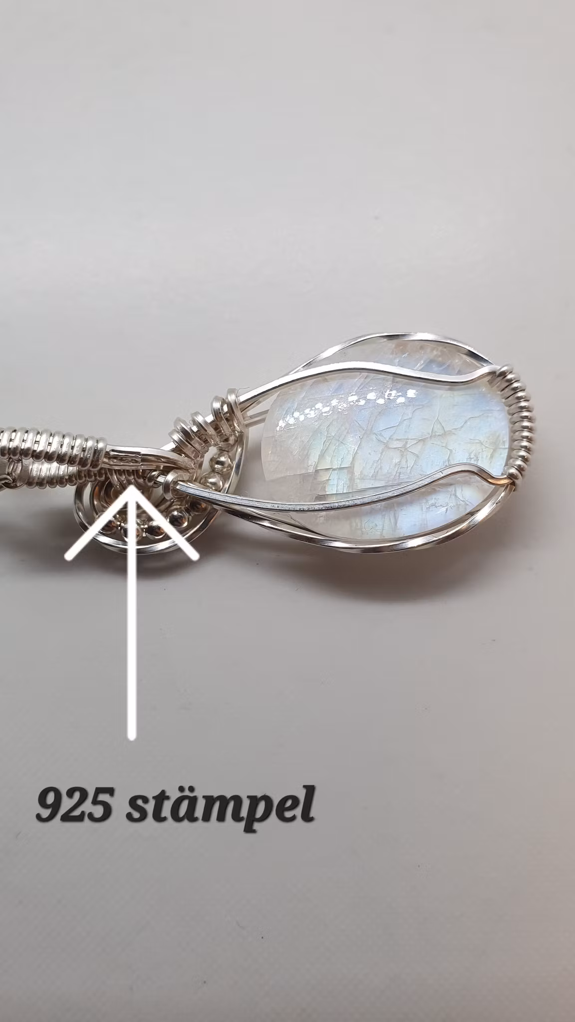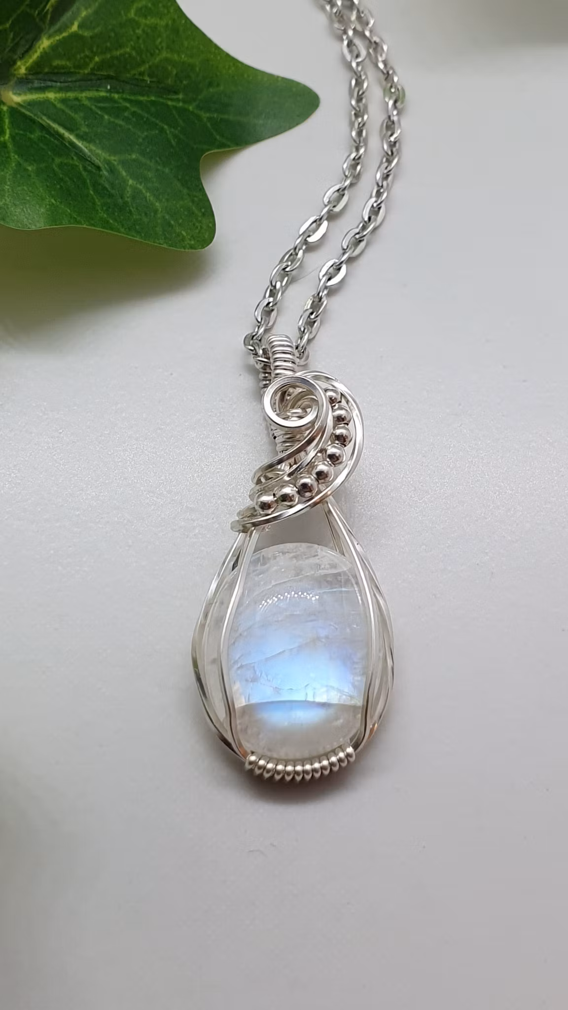 Ett underbart halsband med ett handgjort hänge i äkta silver med en fantastisk blåskimrande regnbågsmånsten. Hänget har en virvlande design med söta silverpärlor.