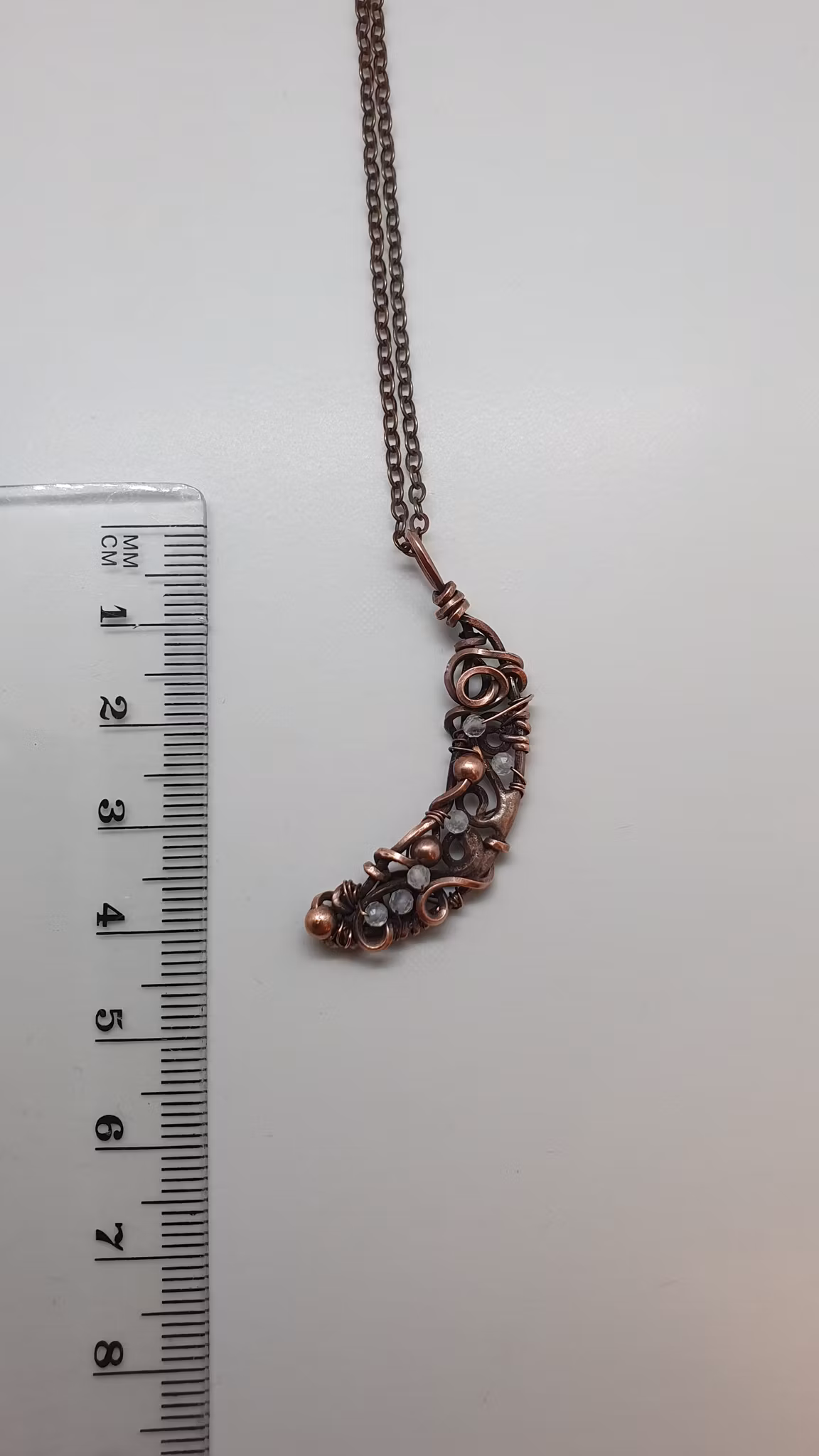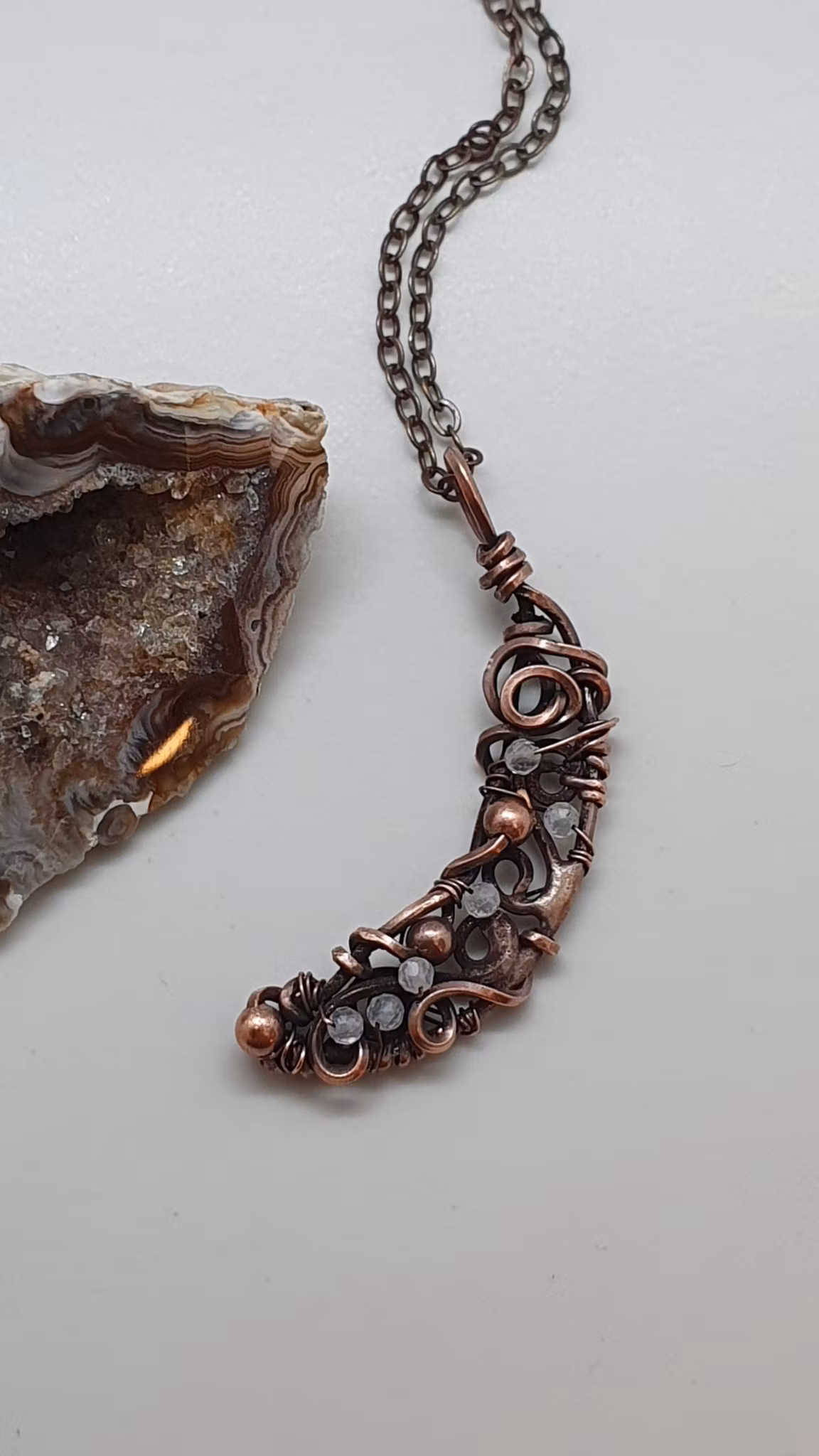 Ett sagolikt halsband med ett hänge i oxiderad koppar som jag format till en månskära. Jag har lött formen, fäst koppartråd i fina slingor och dekorerat hänget med små facetterade pärlor av regnbågsmånsten.