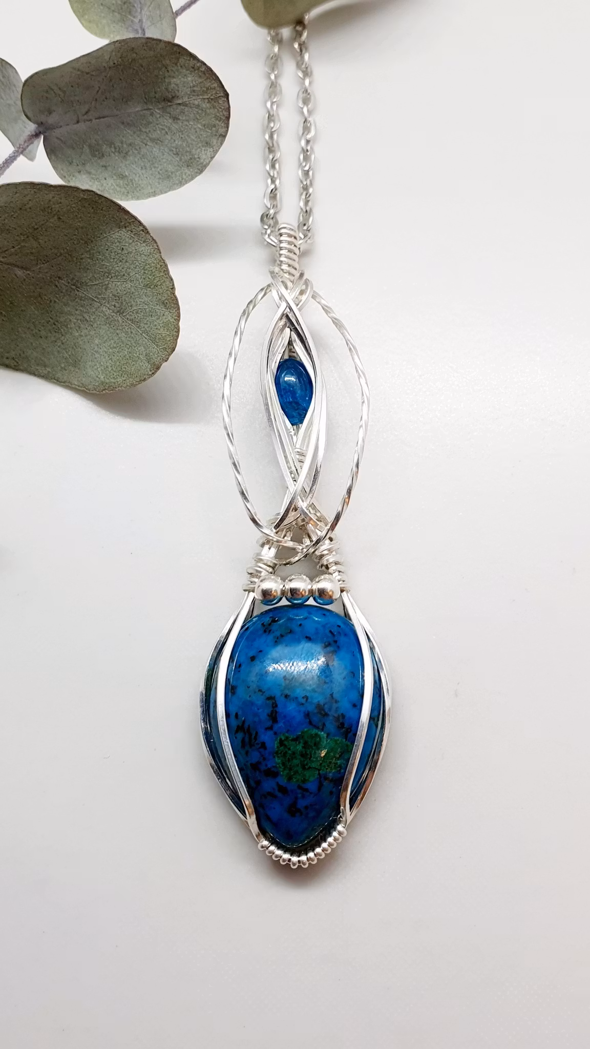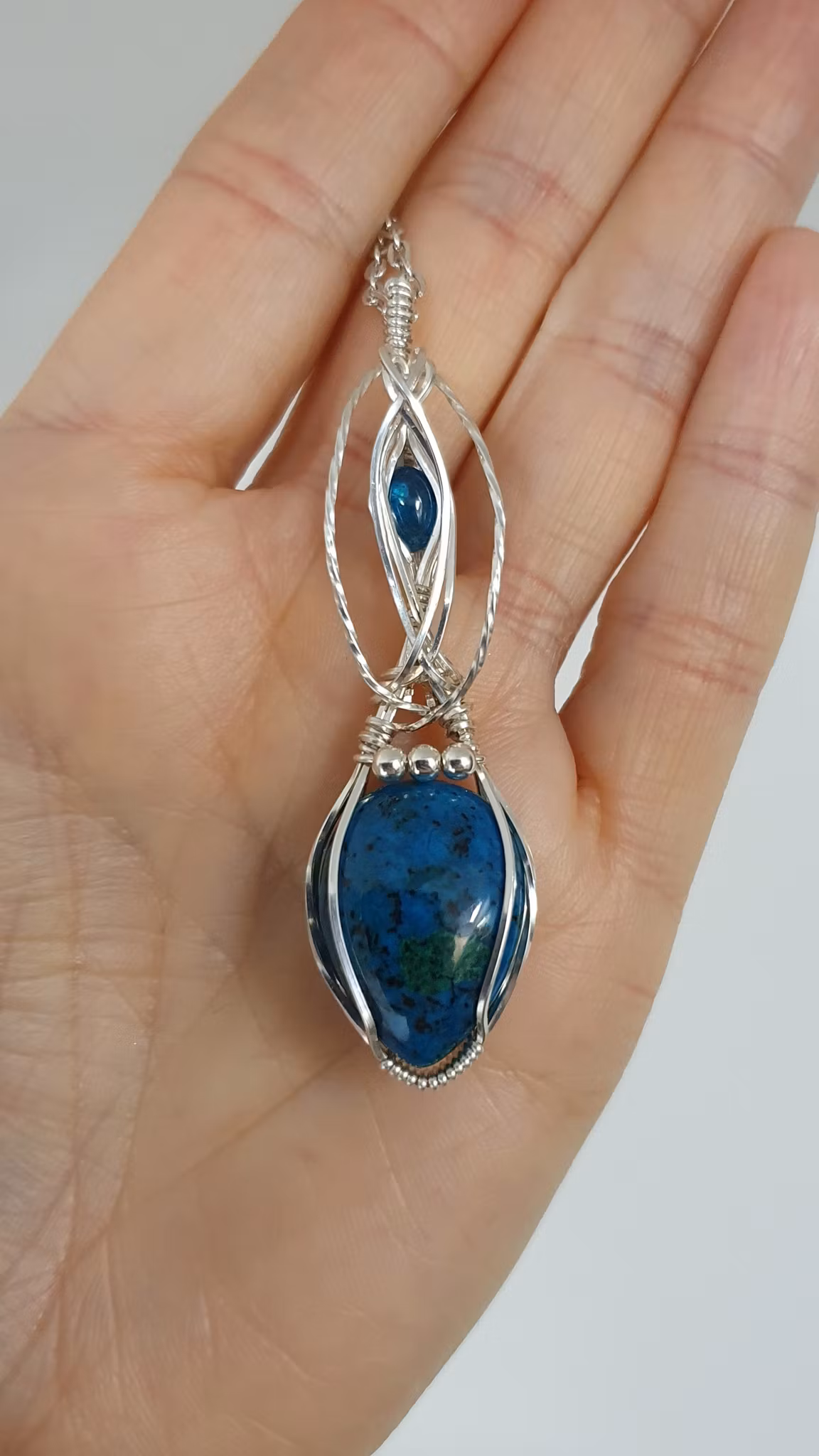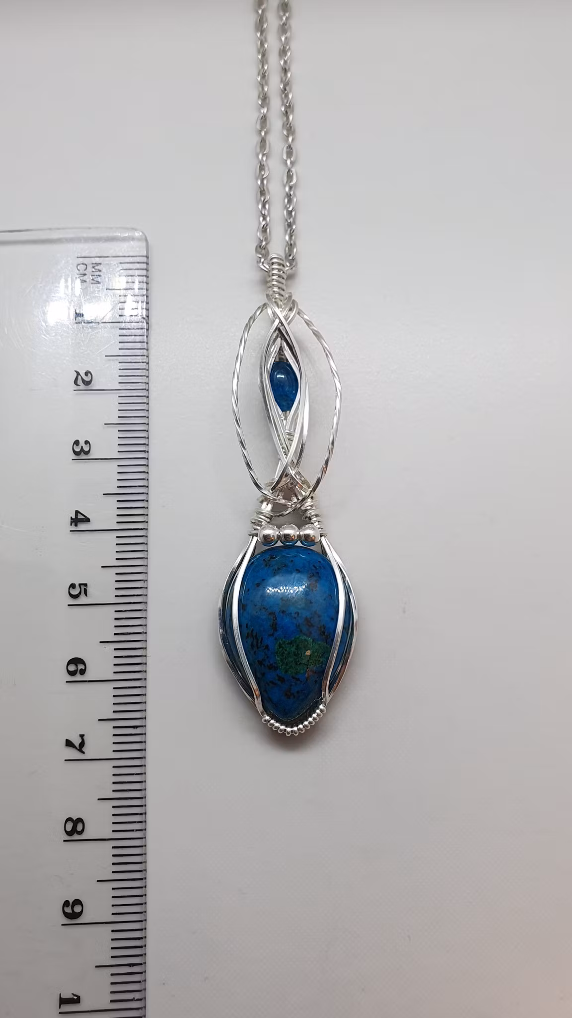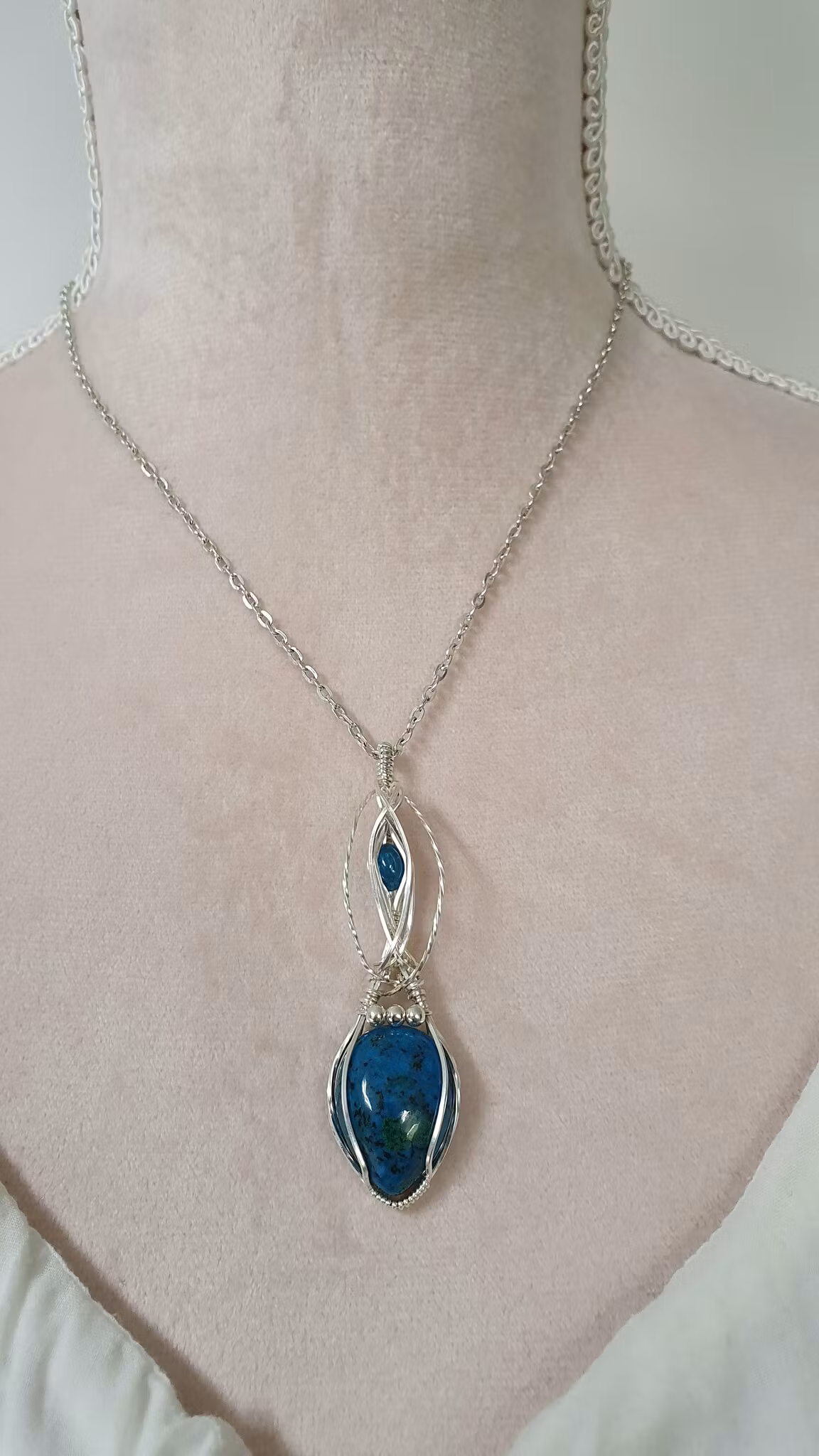 Ett magiskt halsband med ett handgjort hänge i äkta silver. Jag har infattat stenen krysokolla malakit och även dekorerat hänget med en underbar apatit och silverpärlor.