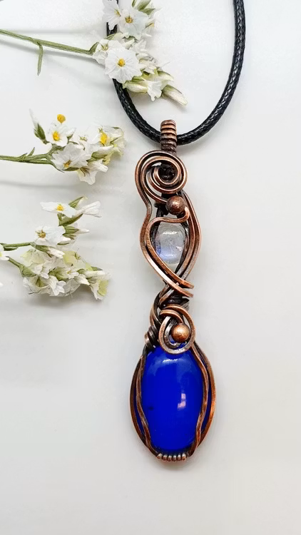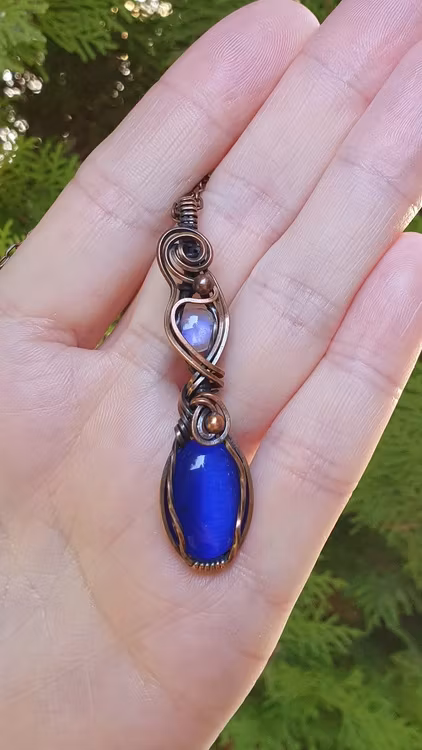 Häftigt hänge i oxiderad koppar med en blå cat's eye glascabochon och en blåskimrande regnbågsmånsten högst upp. Små kopparpärlor pryder trådarna som en fin detalj.