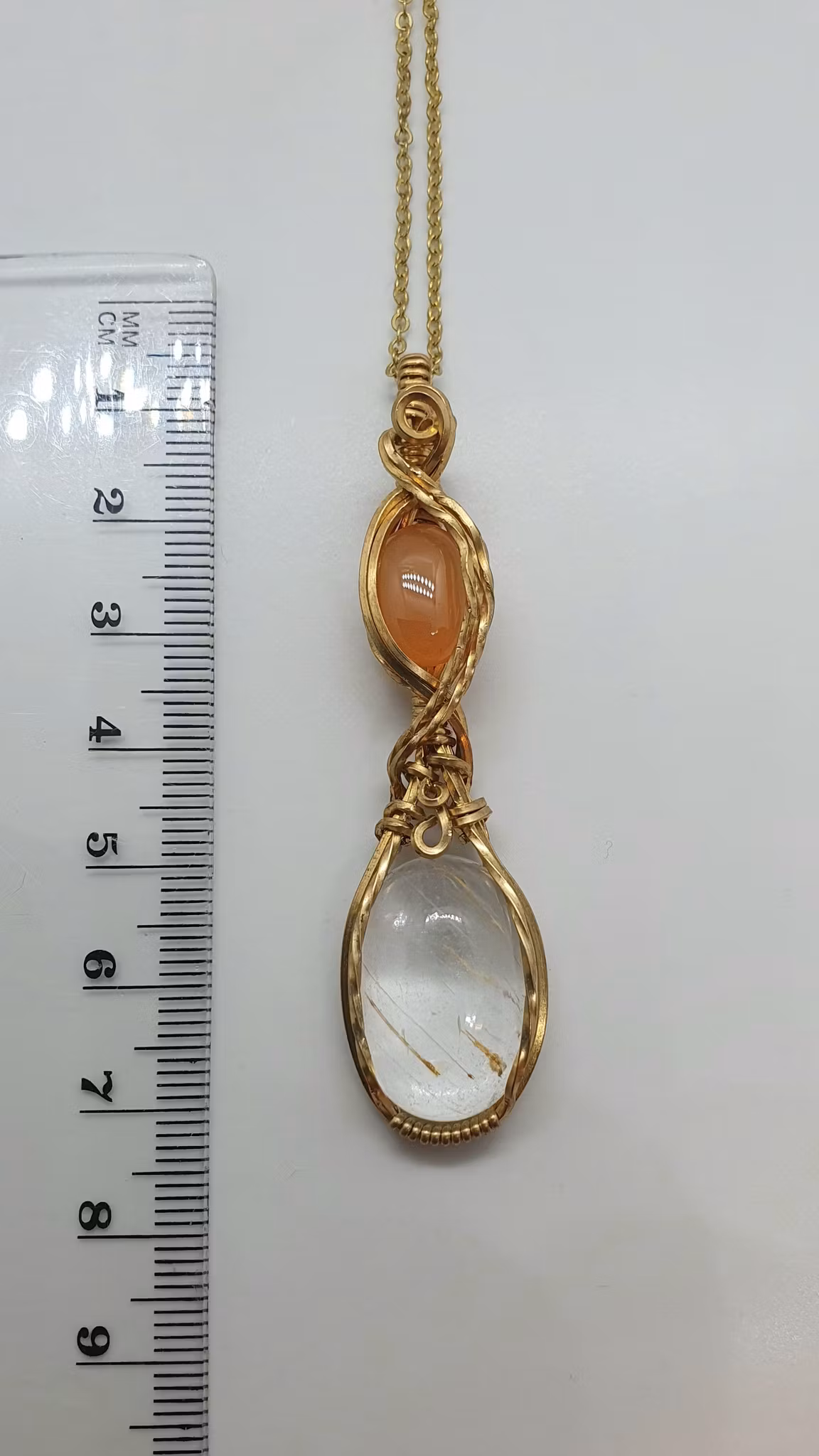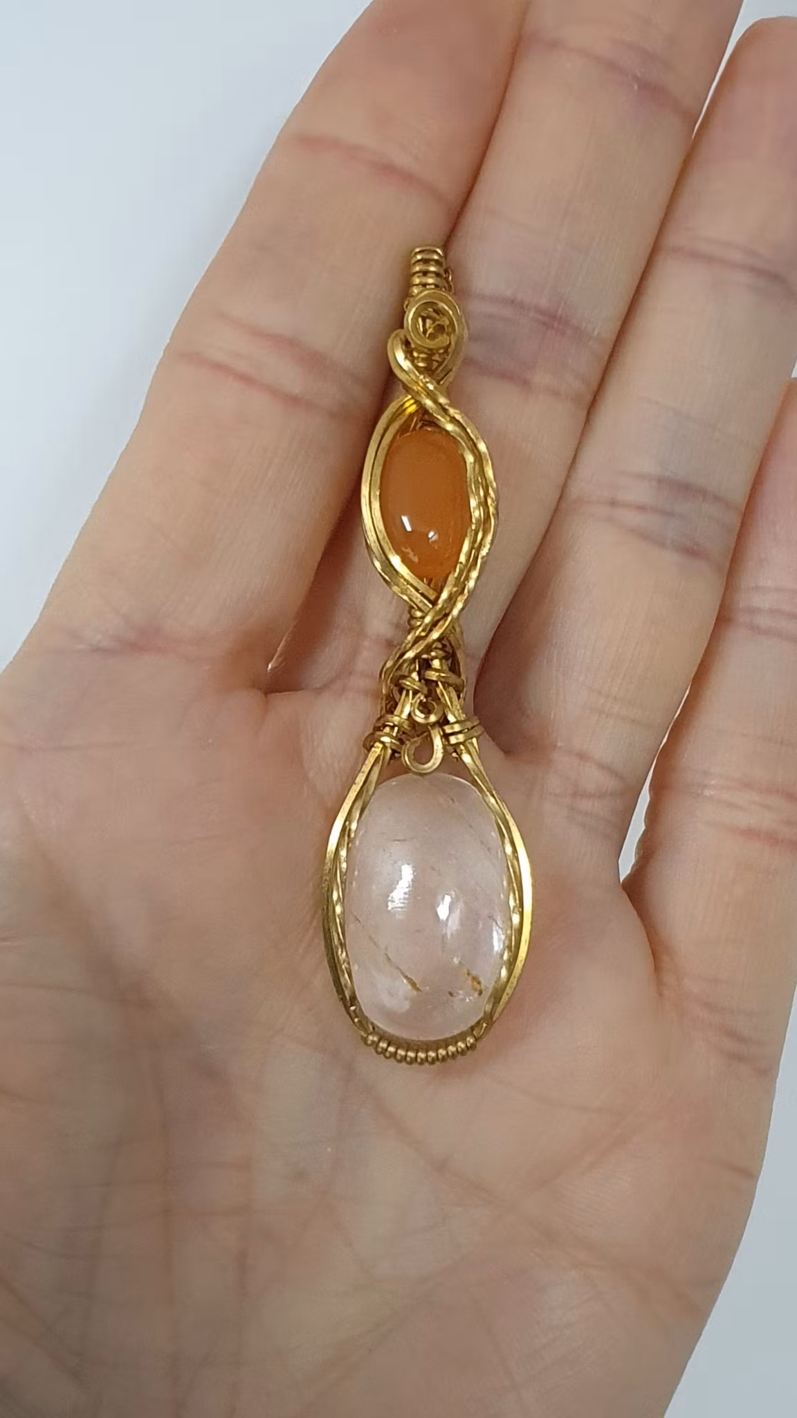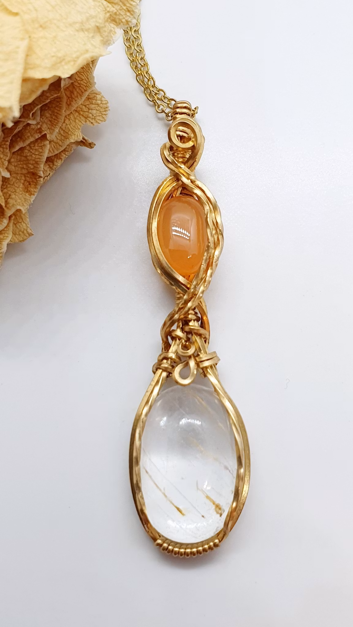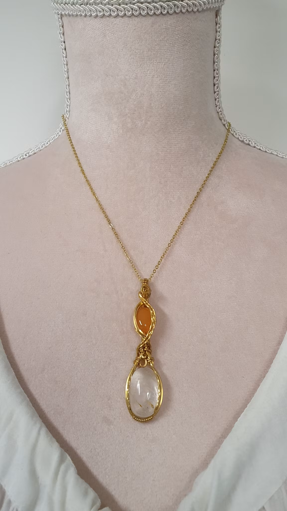 Ett vackert halsband med ett hänge i mässing där jag fäst en topas och en liten karneol. Topasen har orangea inklusioner som matchar karneolen fint.