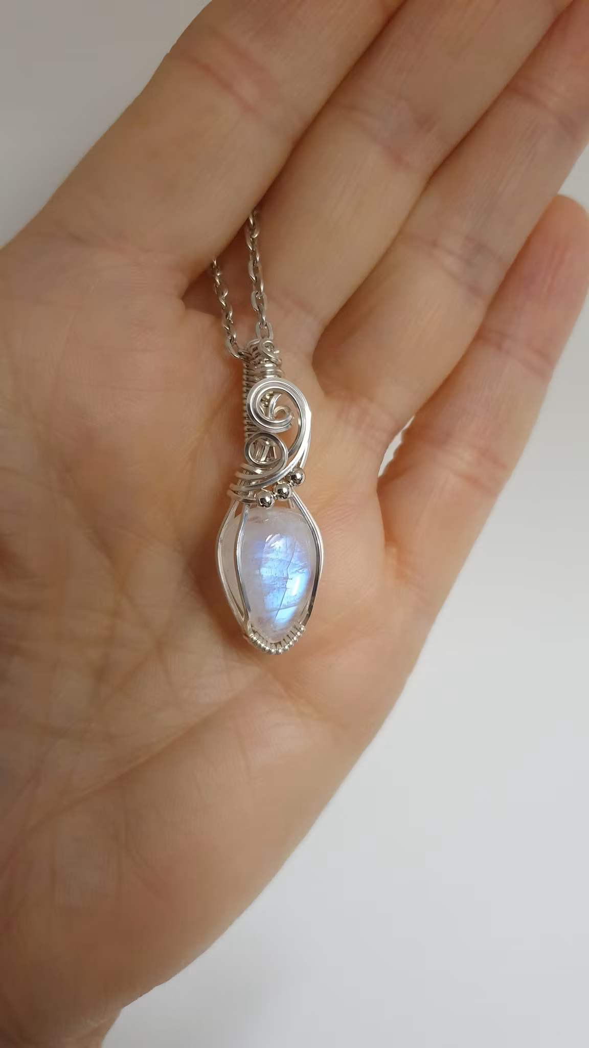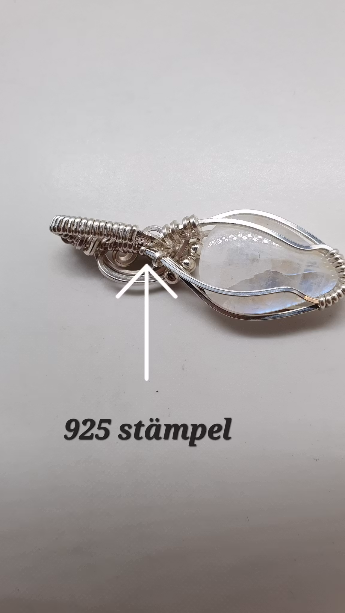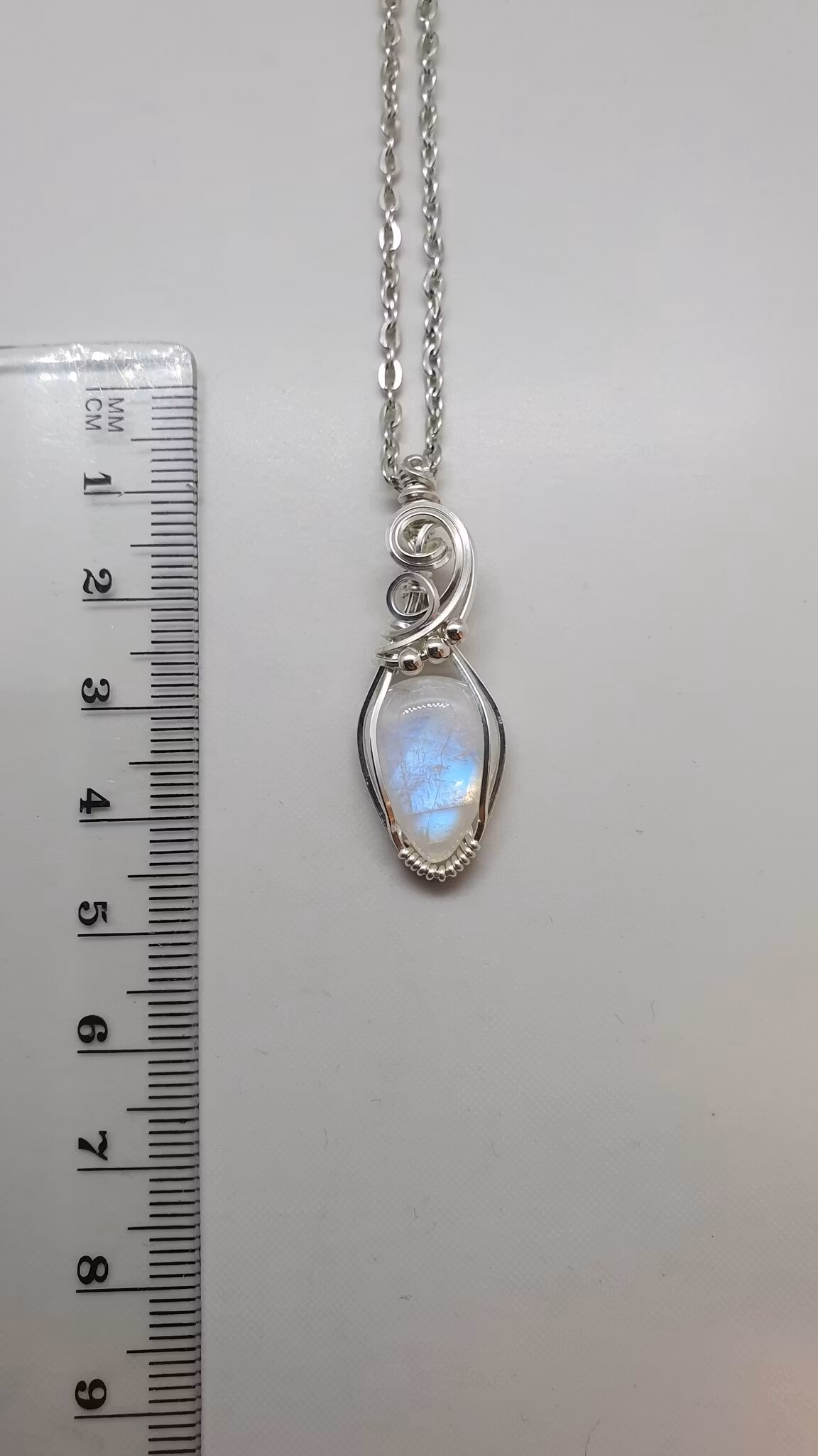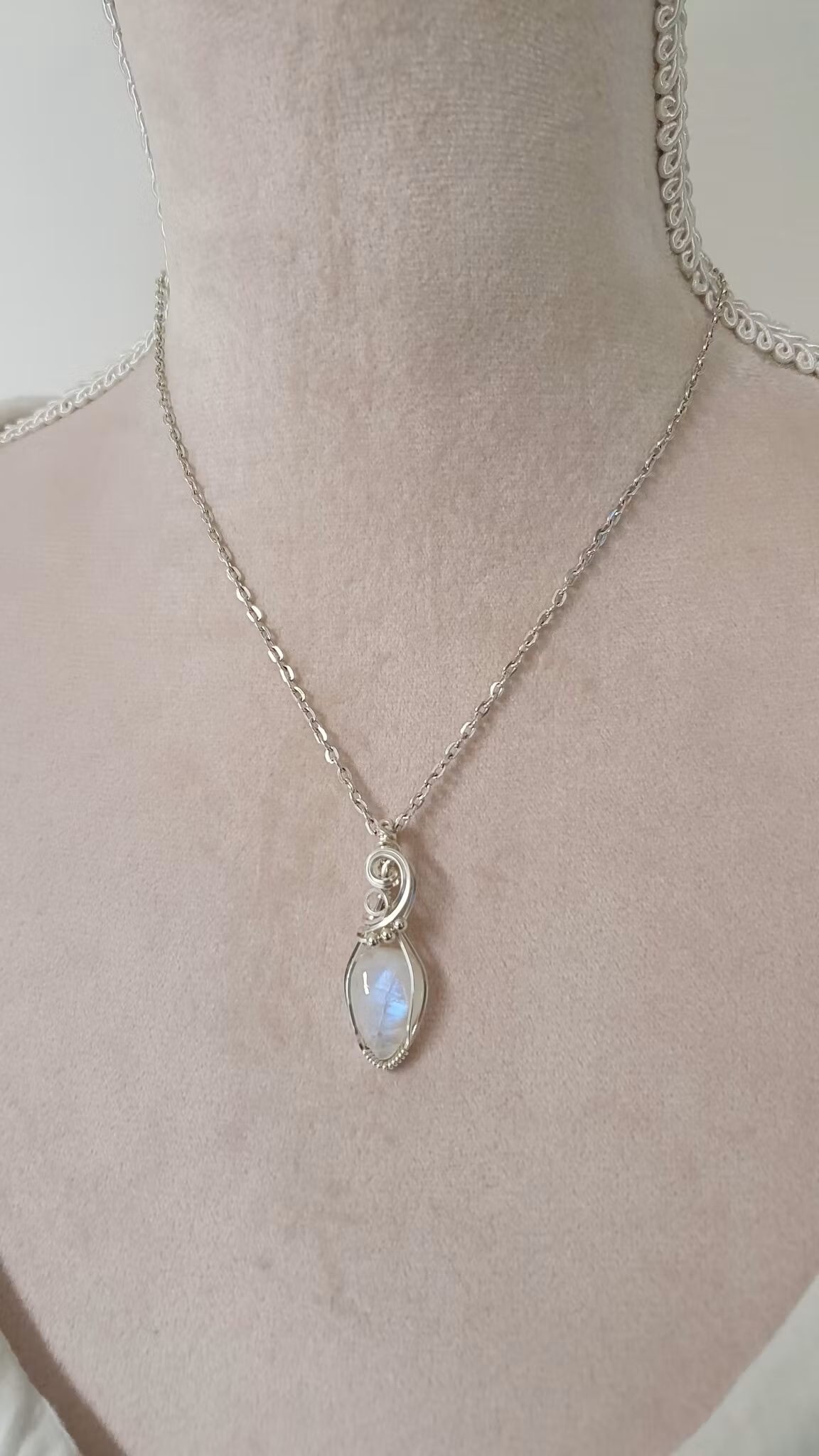 Ett ljuvligt halsband med ett handgjort hänge i äkta silver med en fantastisk blåskimrande regnbågsmånsten. Hänget har en virvlande design med söta silverpärlor.
