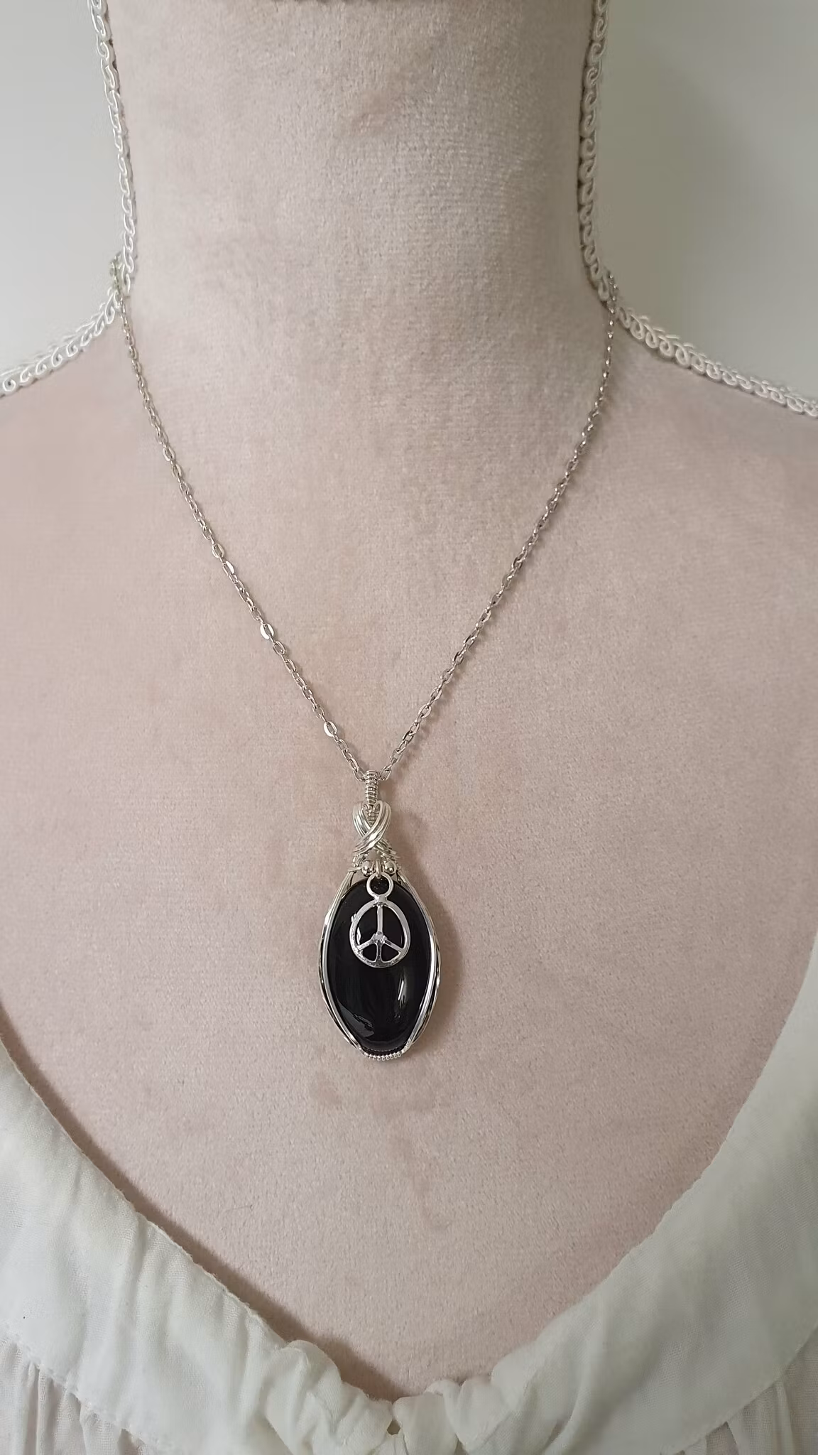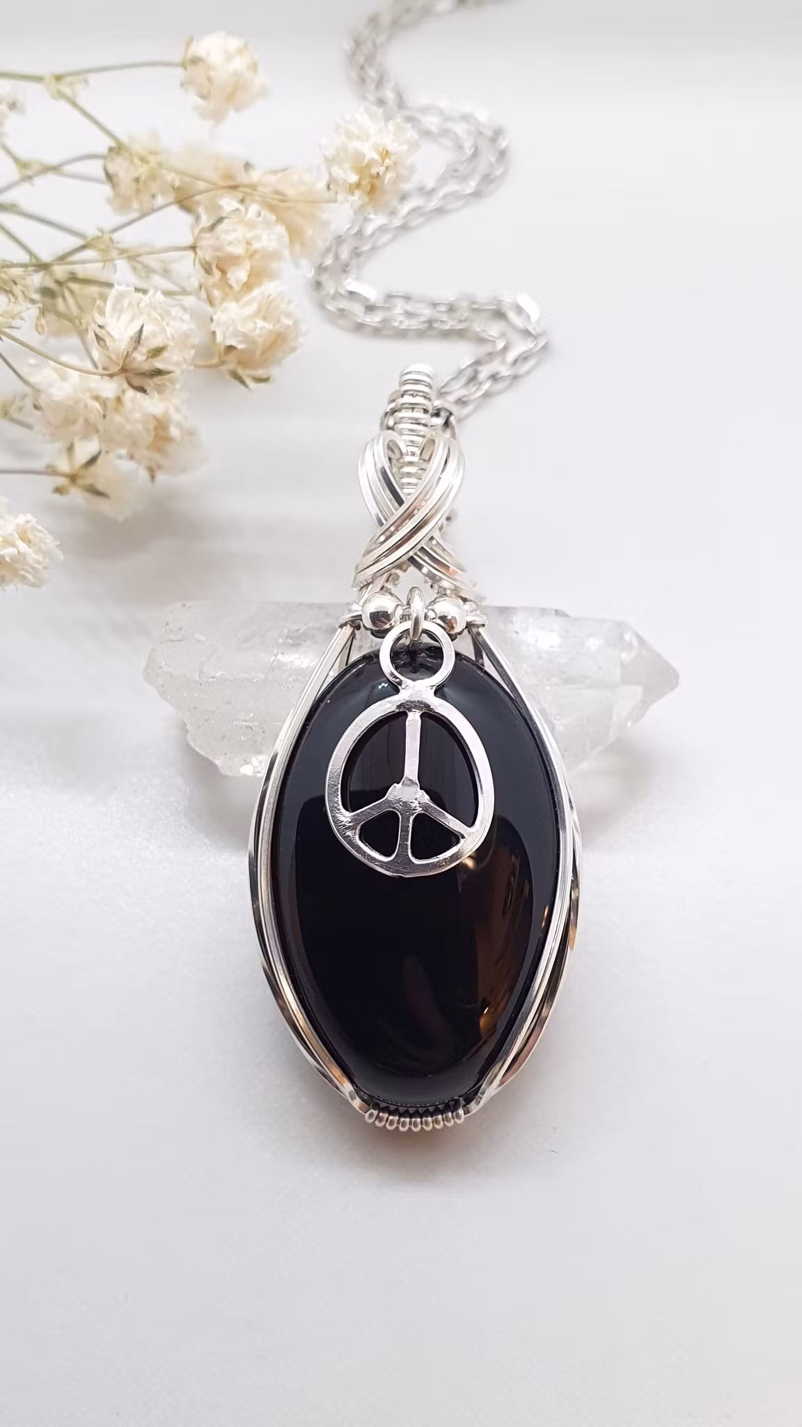 Ett betydelsefullt hänge handgjort i äkta silver med en svart agat och en handsmidd berlock med symbolen peace.