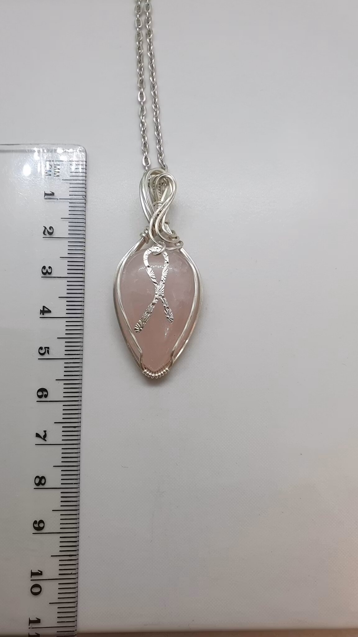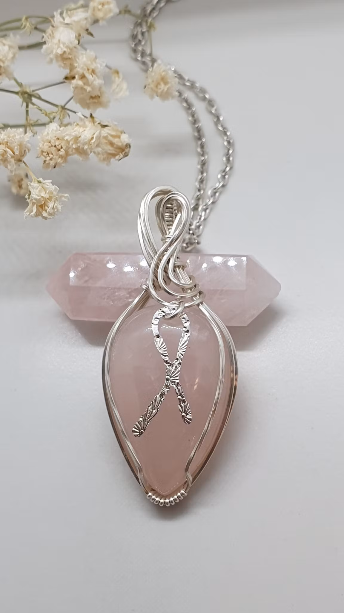 Material: hela hänget är gjort i äkta 925 sterlingsilver, rosenkvarts, handsmidd rosa bandet symbol i äkta silver