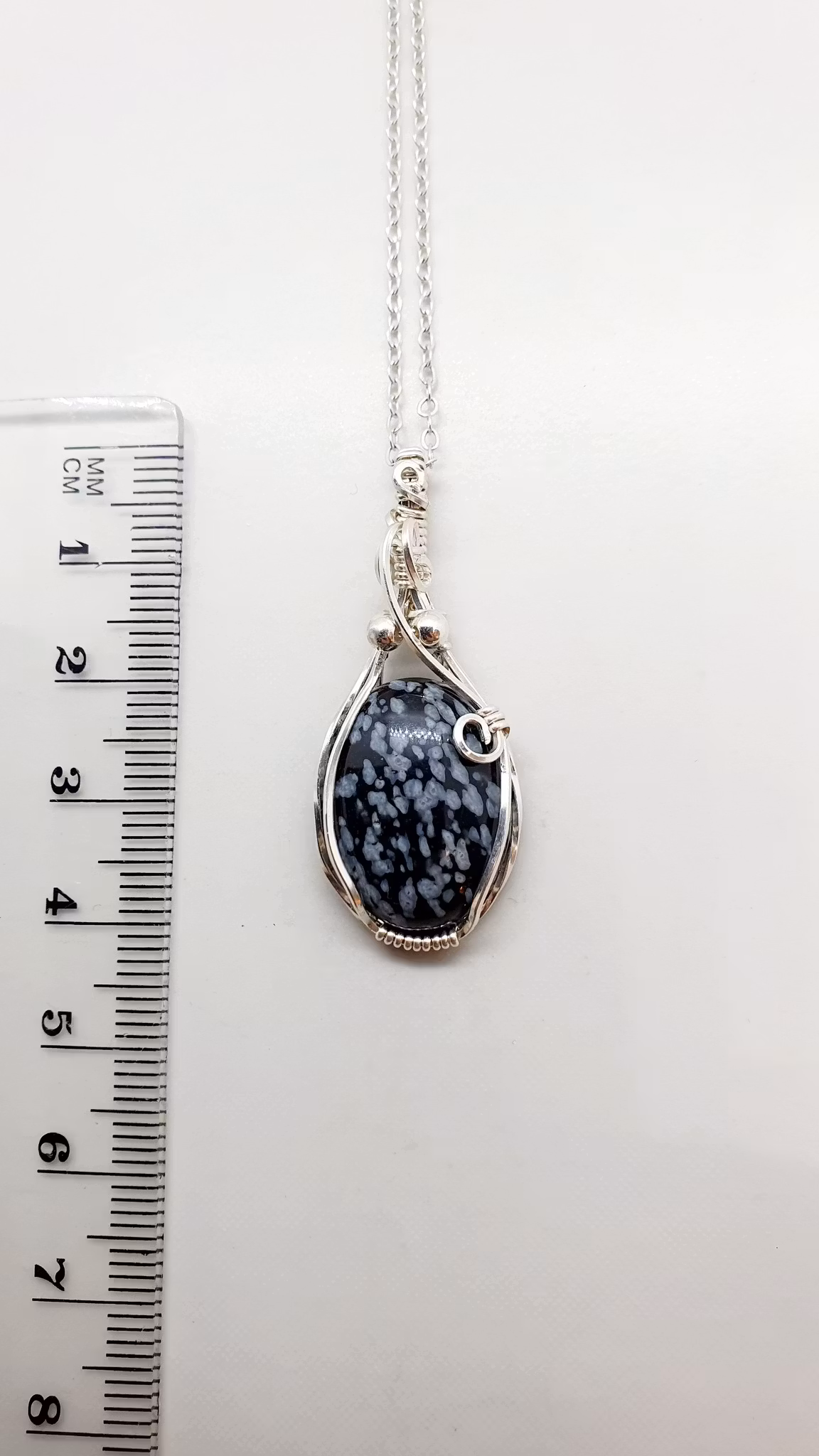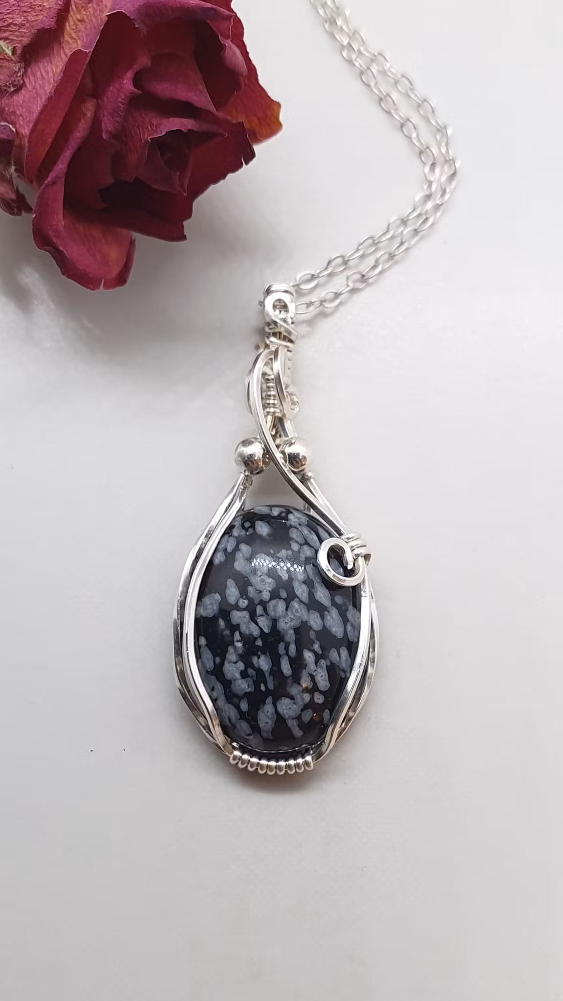 Ett elegant halsband med ett hänge i 925 sterlingsilver där jag fäst en vacker snöflingeobsidian och dekorerat med silverpärlor.
