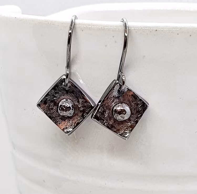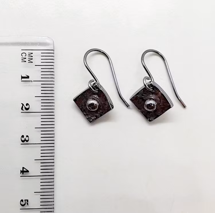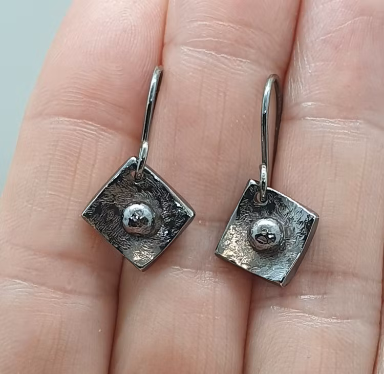 Häftiga örhängen i oxiderat 925 sterlingsilver med mönstrad yta. Oxideringen är mörk och liknar gunmetal.
