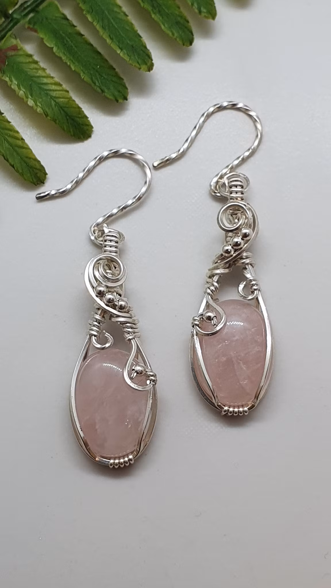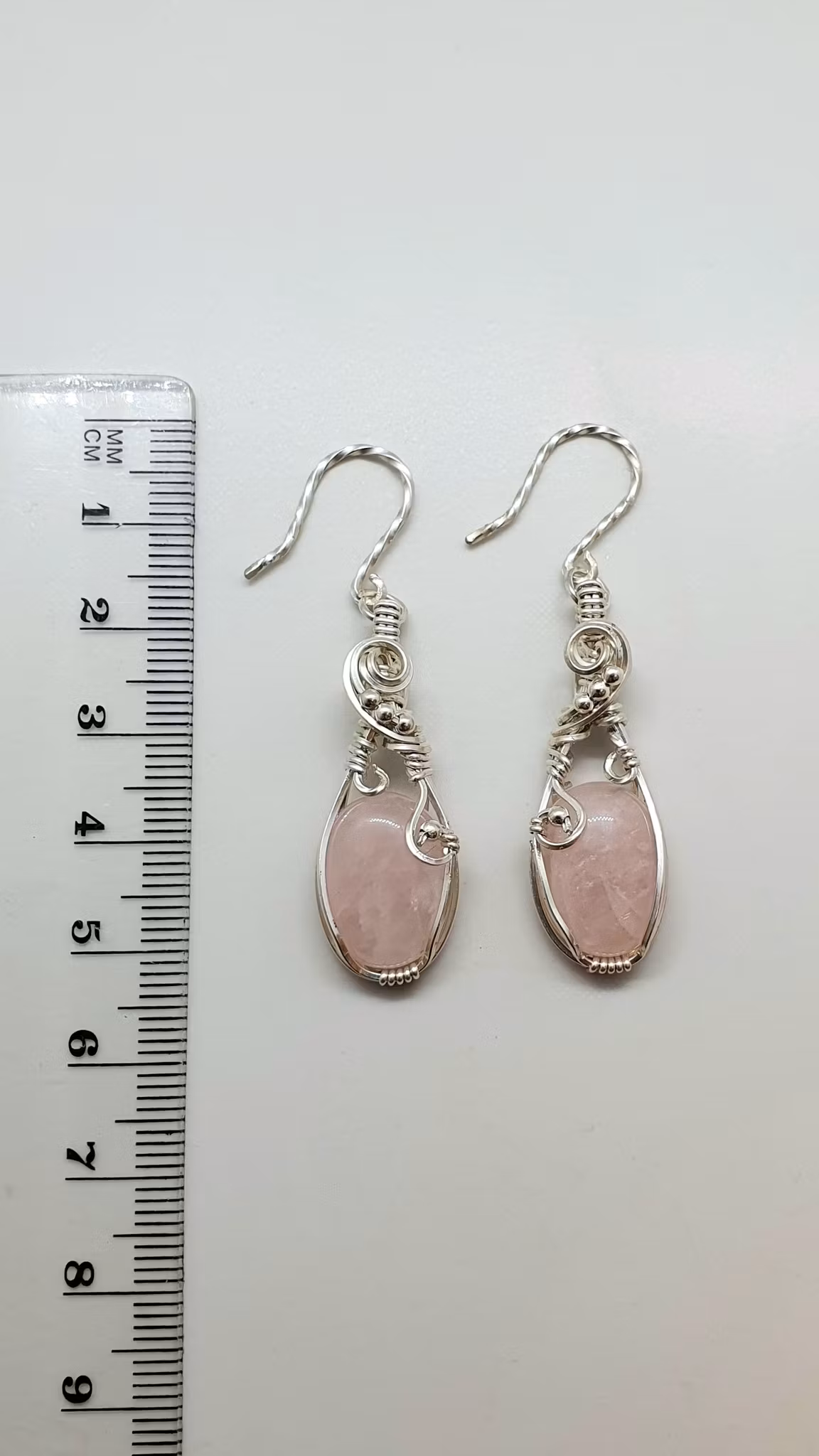Material: äkta 925 sterlingsilver tråd, rosenkvarts, handgjorda öronkrokar i 925 sterlingsilver