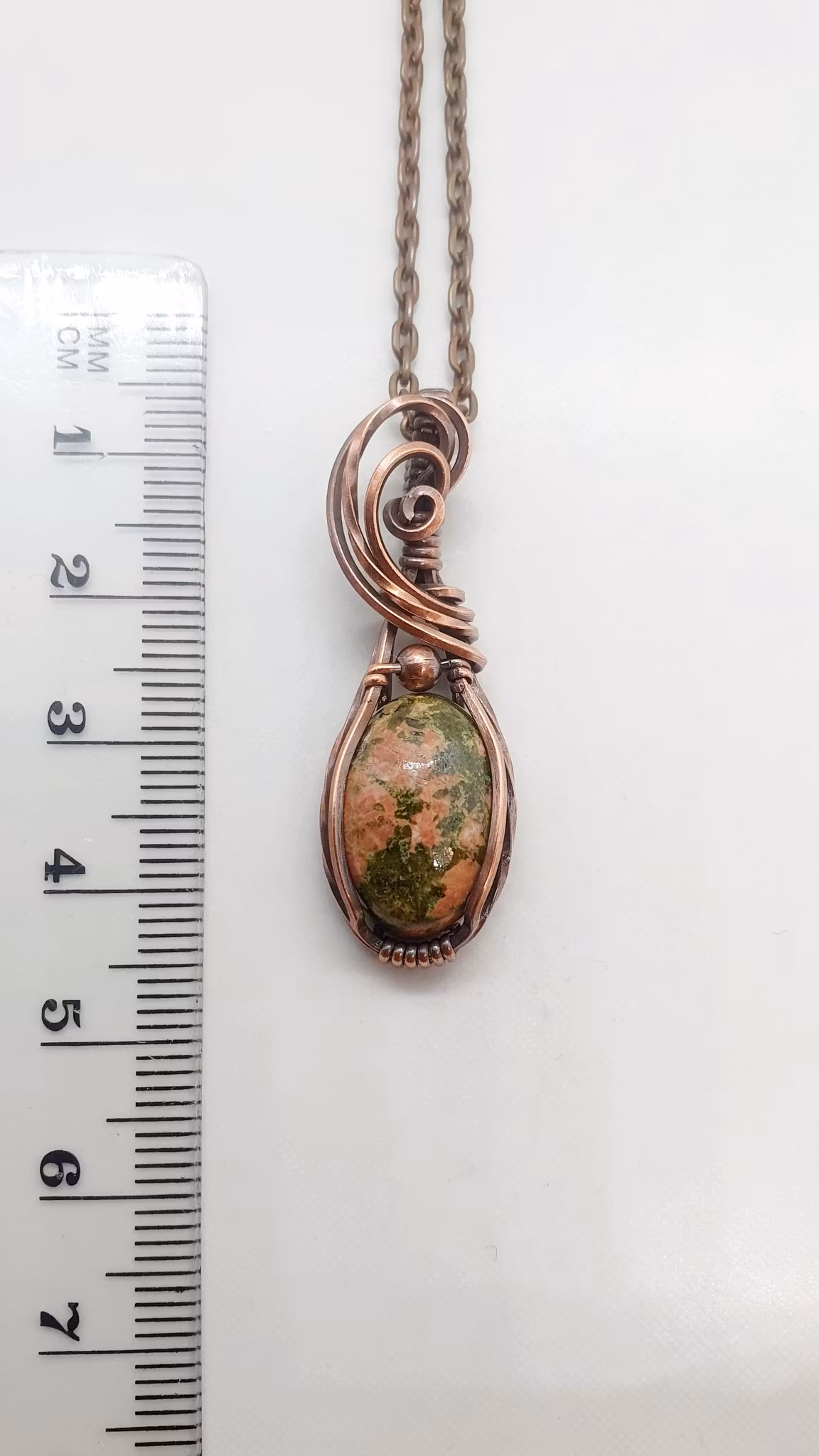 Material: oxiderad koppartråd, sten av unakit, kopparpärla