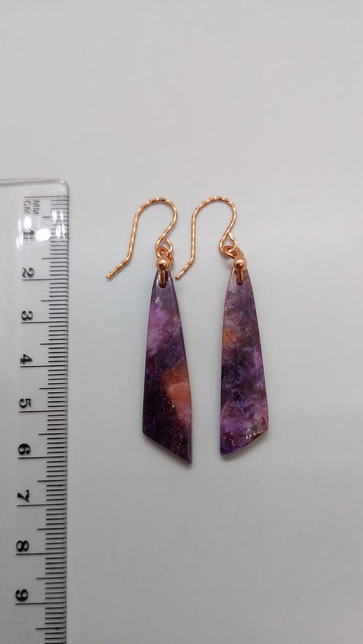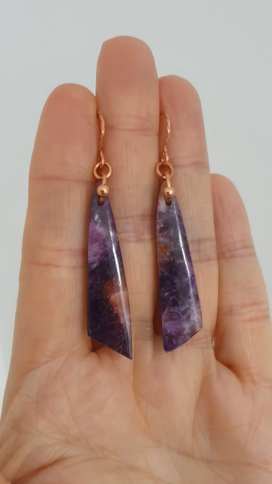 Eleganta örhängen i koppar med vackra stenar av lila kunzit.